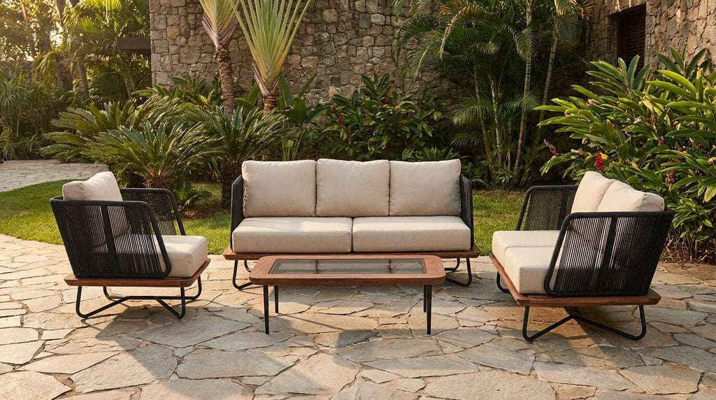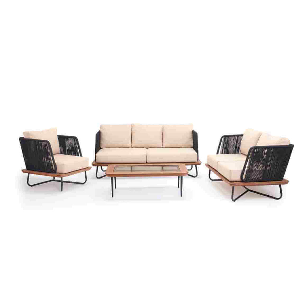 وصف: طقم أثاث خارجى مصنوع من الالومنيوم والخشب مكون من كنبة ثلاثة مقعد واثنين فوتية مناسب فى الحدائق و المساحات الكبيرة